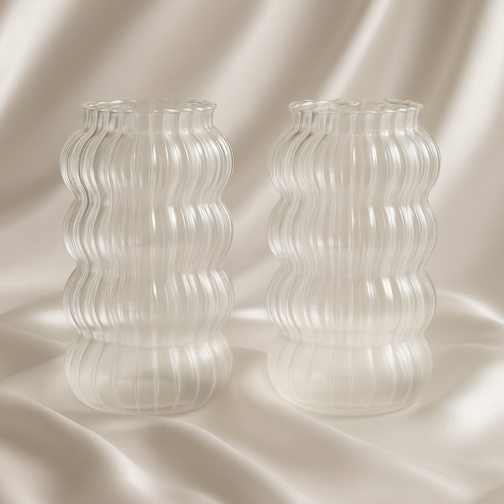 Sklenené poháre s originálnym vlnitým dizajnom, ktoré okamžite upútajú pozornosť a dodajú každému nápoju estetický nádych. Sú vyrobené z kvalitného ľahkého číreho skla, ideálne pre studené nápoje – od osviežujúcej limonády až po lahodné ľadové latte.